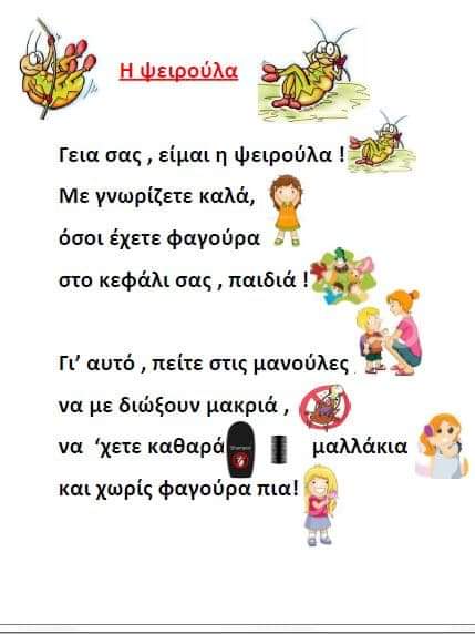 Παρακαλώ να ελέγξετε τα παιδιά σας για να αντιμετωπίσουμε εγκαίρως τα κρούσματα διότι αν ένας μαθητής δεν θεραπευτεί σύντομα θα μεταδώσει τις ψείρες και στους συμμαθητές του.
