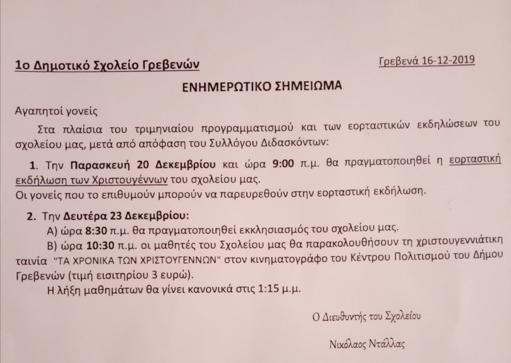 Ο Σύλλογος γονέων και κηδεμόνων σας ενημερώνει οτι εχει δοθεί στα παιδιά σημείωμα από το σχολείο για τις εορταστικές εκδηλώσεις των Χριστουγέννων.
