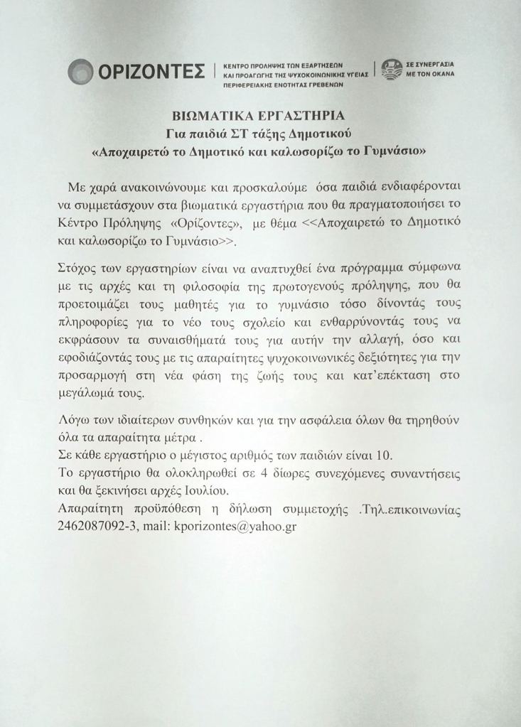 Βιωματικά Εργαστήρια για παιδιά ΣΤ’ τάξης Δημοτικού από το κέντρο ΟΡΙΖΟΝΤΕΣ On 25 Ιον. 2020 By Σύλλογος Γονέων και Κηδεμόνων Κοινοποιήστε: Mοιραστείτε στο Facebook(Ανοίγει σε νέο παράθυρο) Facebook Σχετικά