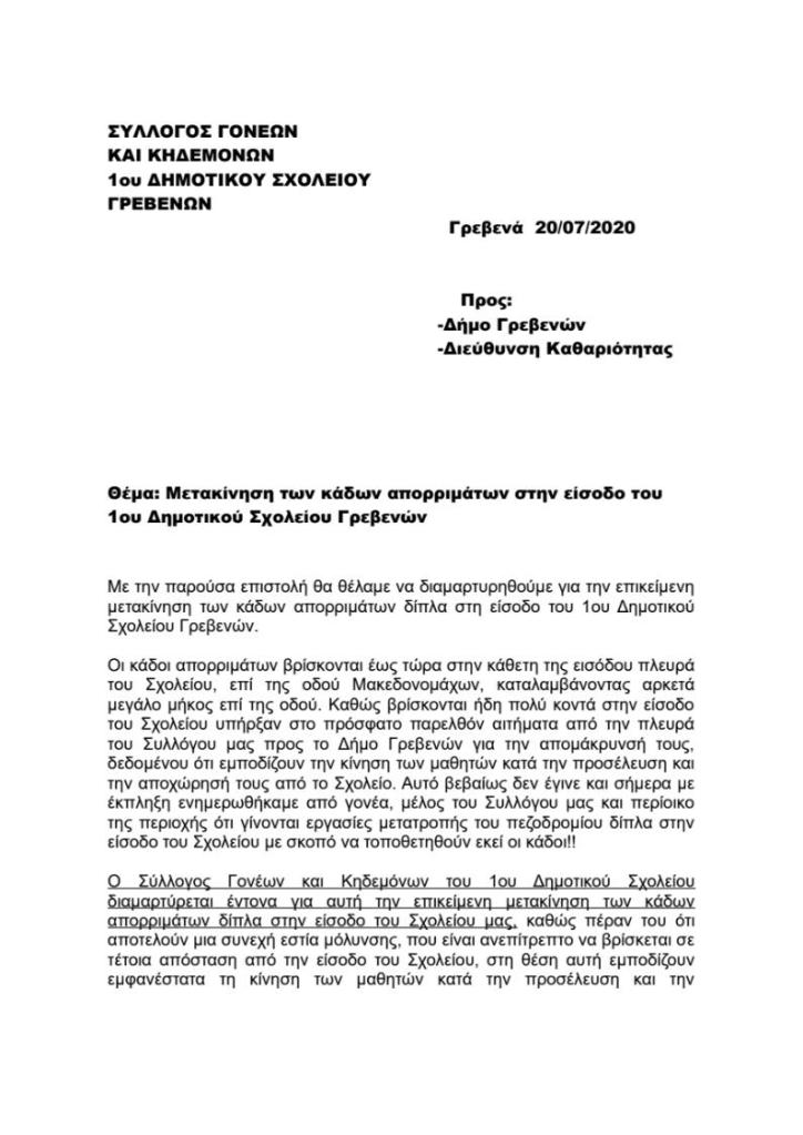 Μετακίνηση των κάδων απορριμάτων στην είσοδο του 1ου Δημοτικού Σχολείου Γρεβενών On 19 Σεπτ. 202019 Σεπτ. 2020 By Σύλλογος Γονέων και Κηδεμόνων Κοινοποιήστε: Mοιραστείτε στο Facebook(Ανοίγει σε νέο παράθυρο) Facebook Σχετικά